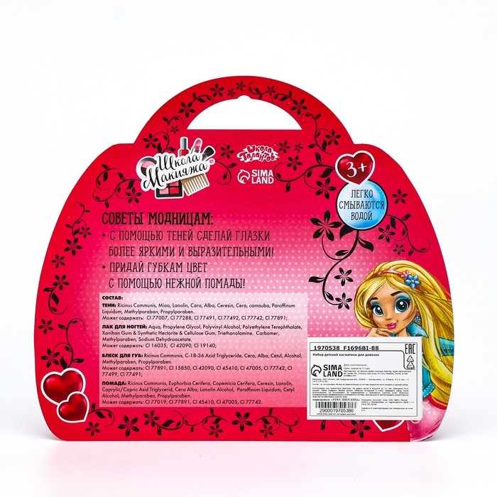 Детская косметика «Школа макияжа» позволит ребёнку экспериментировать со стилем. Набор поможет девочке подобрать оптимальные варианты для вечерних и дневных образов. Косметика без труда смывается водой или с помощью ватного диска и безопасна для детской кожи.
