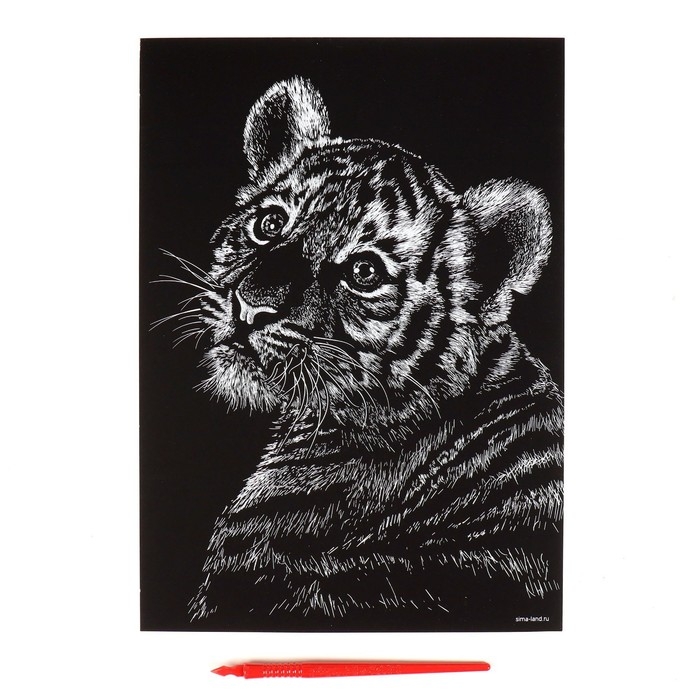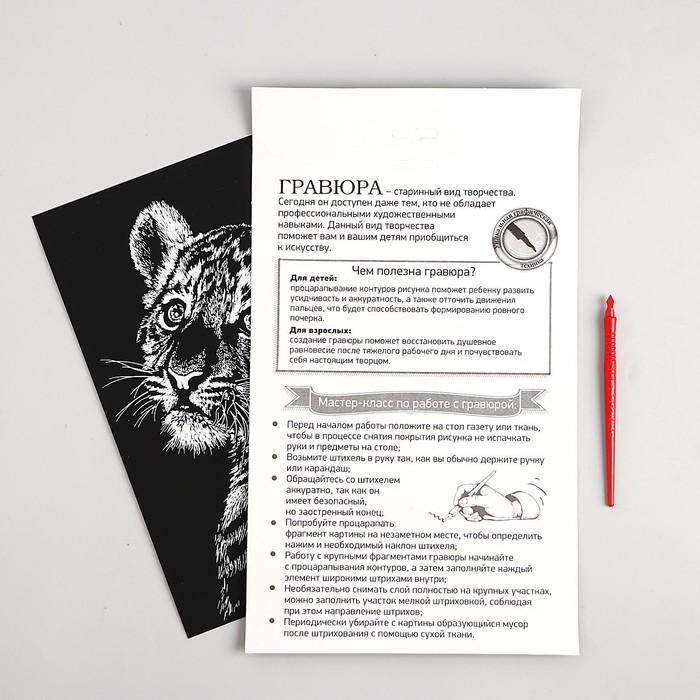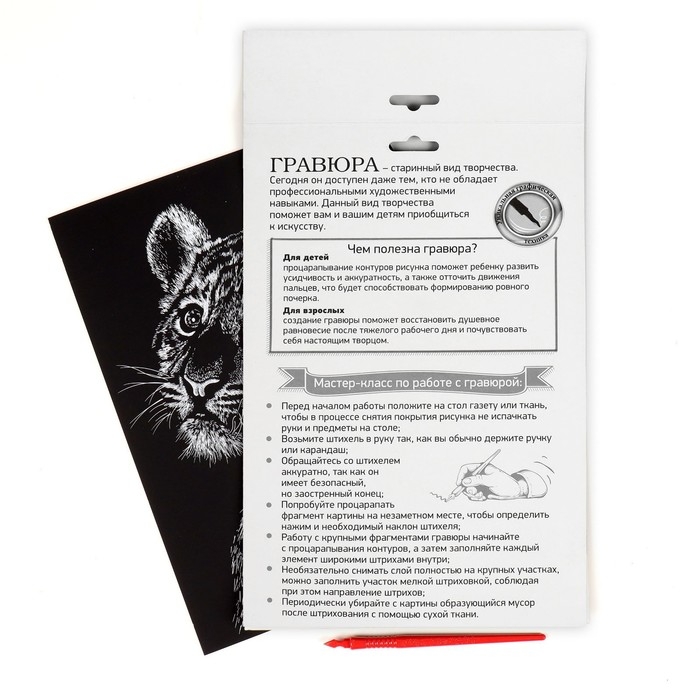 Гравюра представляет собой многослойное панно, покрытое чёрной краской, на которое нанесён контур рисунка. С помощью особого скребка (штихеля), который входит в набор, путём процарапывания и создается гравюра. Новая серия с уникальным дизайном порадует вас разнообразием рисунков.