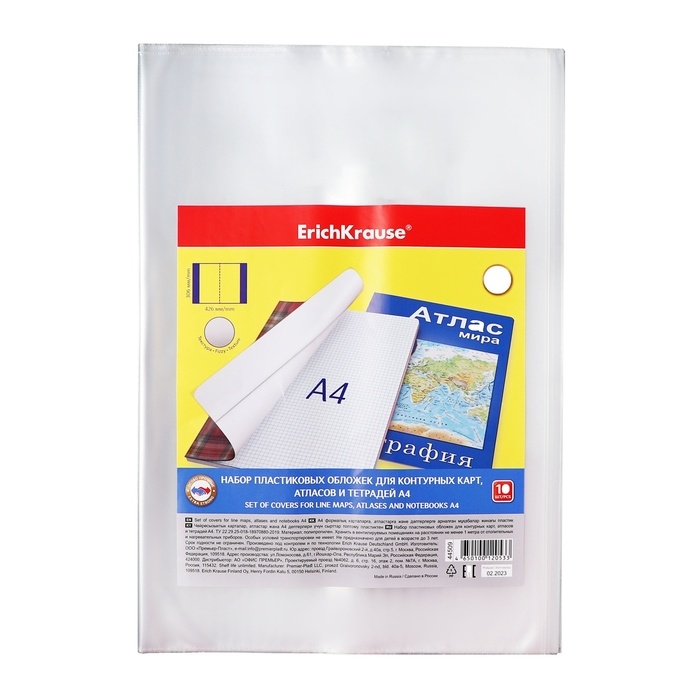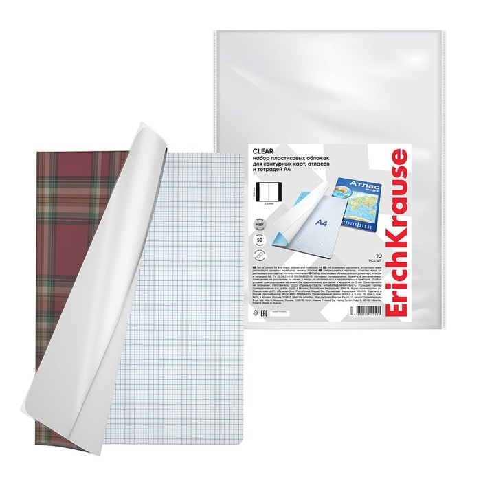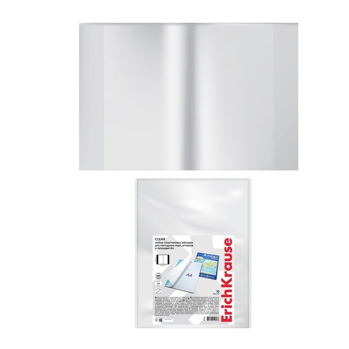 Набор обложек ПП 10 шт, 306 х 426 мм (А4), 50 мкм, ErichKrause "Glossy Clear", для контурных карт, атласов и раб.тетрадей, фиксированная, глянцевые