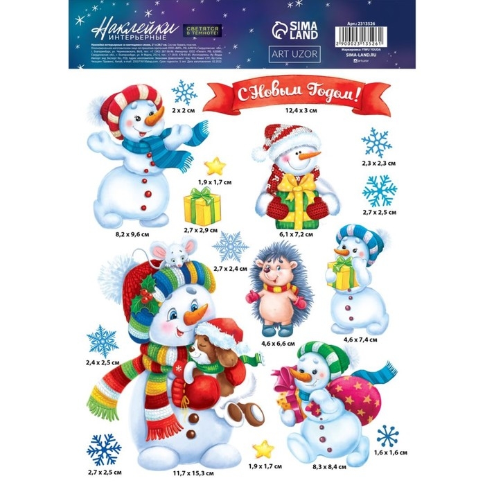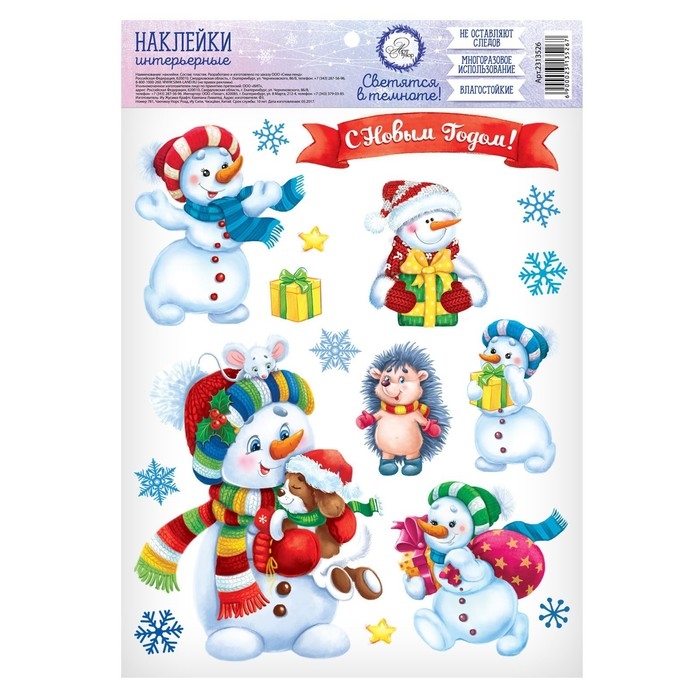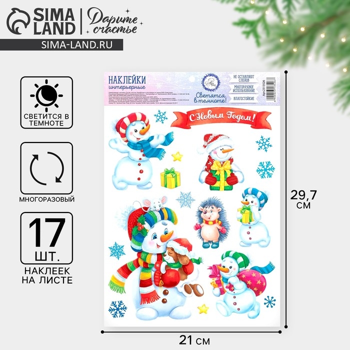Наклейки новогодние, интерьерные со светящимся слоем «Снеговички», 21 х 29,7 см, Новый год