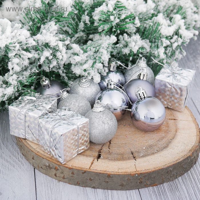 Набор украшений пластик 12 шт "Подарок" (9 шаров, 3 подарка) серебро