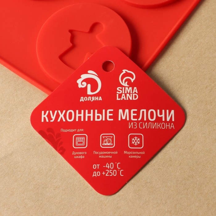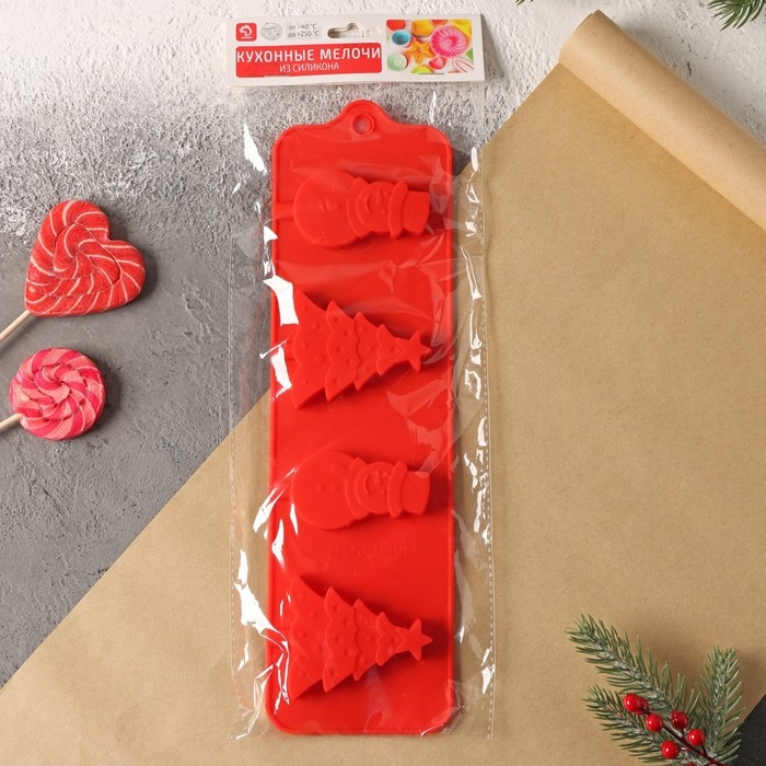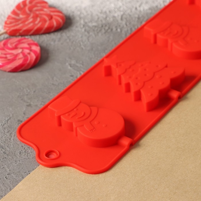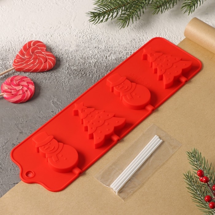 Форма для леденцов новогодняя Доляна «Новый год», силикон, 31×9 см, 4 ячейки, с палочками, цвет красный