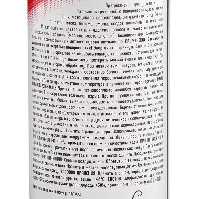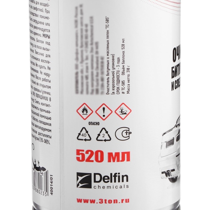 Очиститель битумных и масляных пятен 3TON ТС-505 520 мл является продуктом, произведенным специально для очистки лакокрасочного покрытия и хромированных деталей кузова автомобиля от стойких загрязнений. Легко очищает от пятен масла, битума, смолы, следов от насекомых и почек липы. Эффективен при удалении следов от малярной ленты, автомобильного консерванта. Специальная формула состава предотвращает его испарение и содержит фиксирующие компоненты, снижающие текучесть жидкости.