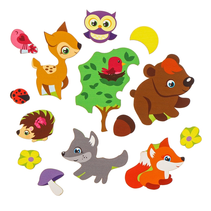 Перед началом игры предложите ребёнку назвать все элементы картинки, их отличительные черты. Затем поместите фигурки на соответствующие места. Чтобы малышу было интереснее, придумайте захватывающую историю (как зовут зверят, куда они все идут и т.д.).