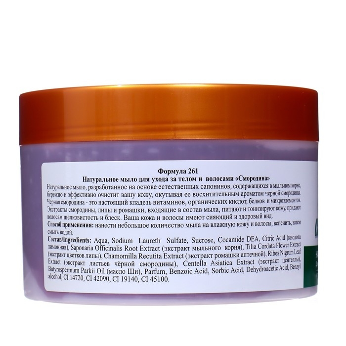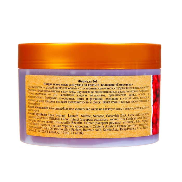 Описание: натуральное мыло, разработанное на основе естественных сапонинов, содержащихся в мыльном корне, бережно и эффективно очистит вашу кожу, окутывая ее восхитительным ароматом черной смородины. Черная смородина — это настоящий кладезь витаминов, органических кислот, белков и микроэлементов. Экстракты смородины, липы и ромашки, входящие в состав мыла, питают и тонизируют кожу, придают волосам шелковистость и блеск. Ваша кожа и волосы имеют сияющий и здоровый вид.