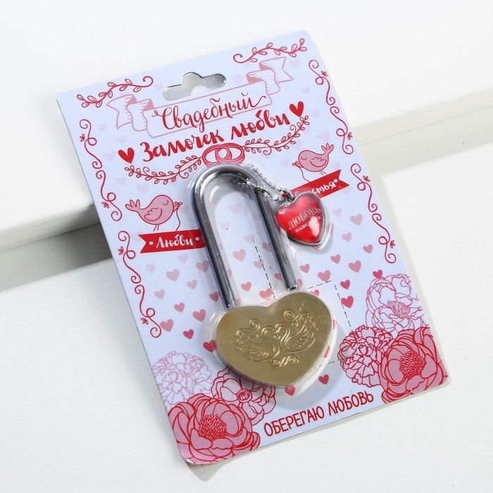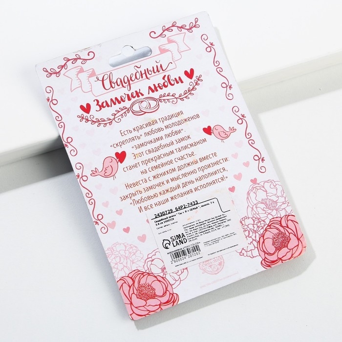 Замок для торжественной свадебной традиции - это символ любви. Навесной замок любви на свадьбе становится символом нерушимого союза, заключенного влюбленными в этот день. По традиции замок вешается на мост, загадывается желание о счастливой семейной жизни. Это делается для того, чтобы никто никогда не смог открыть этот замок и нарушить клятву, данную влюбленными. Свадебный замок можно повесить на мост по традиции или на дерево в специалных парках или аллеях молодожен, которые есть во многих городах. Традиция закрывать замок на свадьбу объединяет сердца мужа и жены навсегда. Свадебный декоративный замочек будет отлично смотреться на фотосессии и видео.