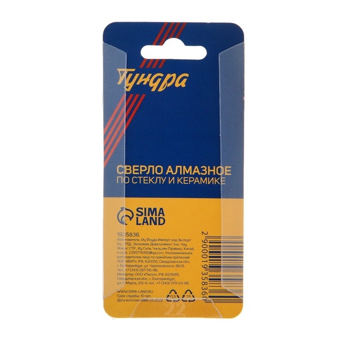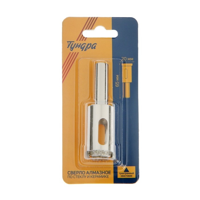 Сверло алмазное по стеклу и керамике ТУНДРА, трехгранный хвостовик, 20 х 65 мм