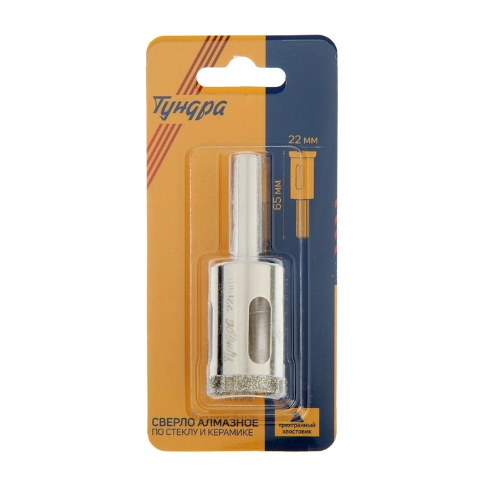 Сверло алмазное по стеклу и керамике ТУНДРА, трехгранный хвостовик, 22 х 65 мм