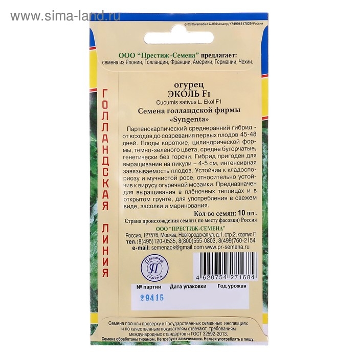 Семена Огурец "Эколь" F1, раннеспелый, партенокарпический, 10 шт
