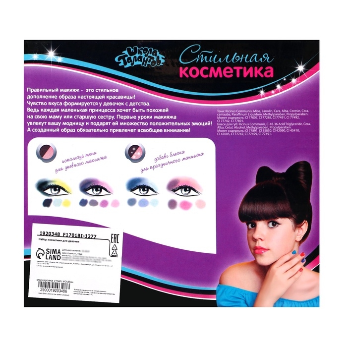 Детская косметика «Школа талантов» позволит ребёнку экспериментировать со стилем. Набор теней поможет девочке подобрать оптимальные варианты для вечерних и дневных образов. Косметика без труда смывается водой или с помощью ватного диска и безопасна для детской кожи.