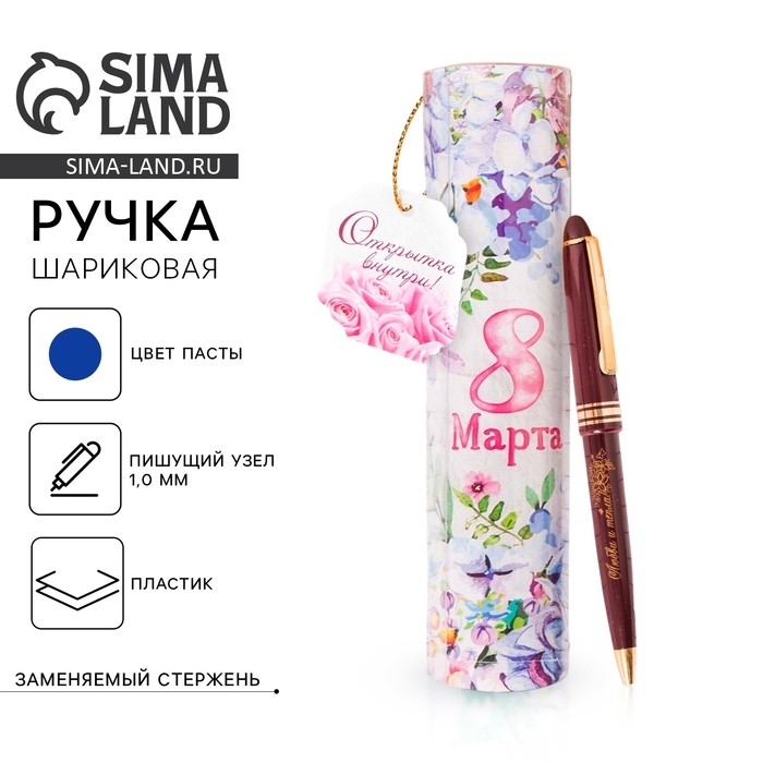Ручка шариковая синяя паста 1.0 мм в тубусе «8 Марта» пластик