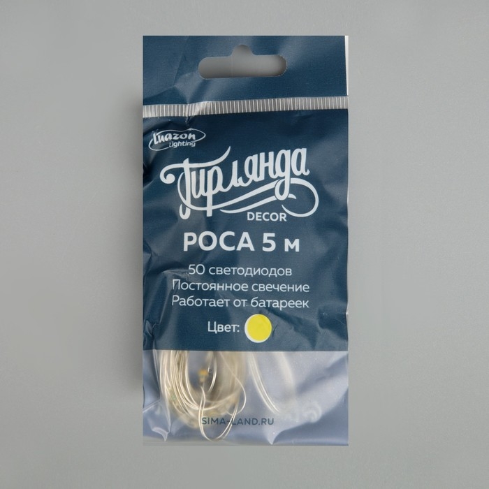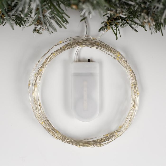 Гирлянда «Нить» 5 м роса, IP20, серебристая нить, 50 LED, батарейки CR2032х2 (в комплекте), свечение жёлтое