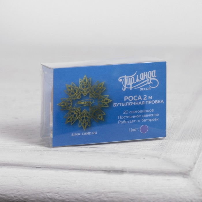 Гирлянда «Нить» 2 м роса с пробкой, IP20, серебристая нить, 20 LED, батарейки LR44х3 (в комплекте), свечение фиолетовое