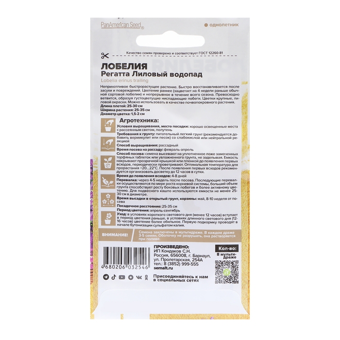 Семена цветов Лобелия Регатта "Жемчужный Водопад" ампельная, О, цп, 8 шт.