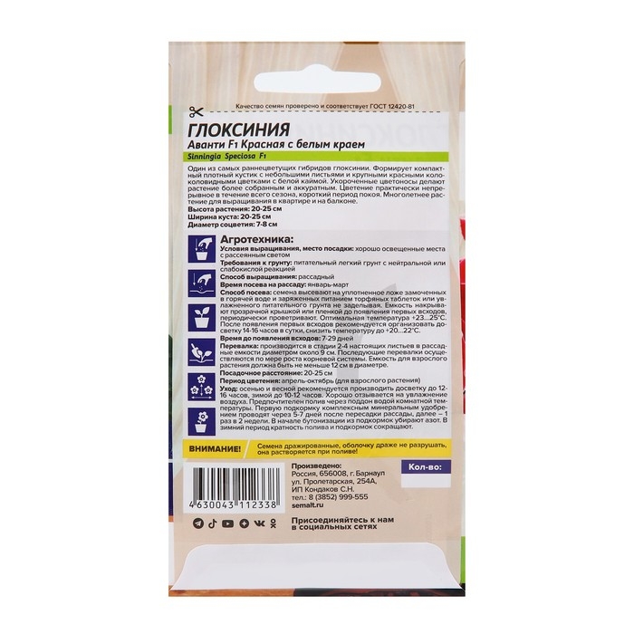 Семена комнатных цветов Глоксиния Аванти "Красная с белым краем", 8 шт.