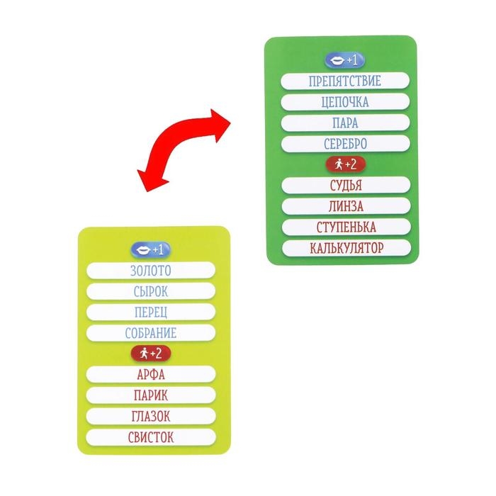 Проявите свои артистические способности — объясняйте с помощью мимики и жестов! Это значит, что нельзя произносить слова и звуки, а также чертить в воздухе очертания букв, цифр и указывать на предметы, о которых идёт речь в карточке. Если игрок объясняет пантомимой, то за каждое отгаданное слово он получает по 2 очка.