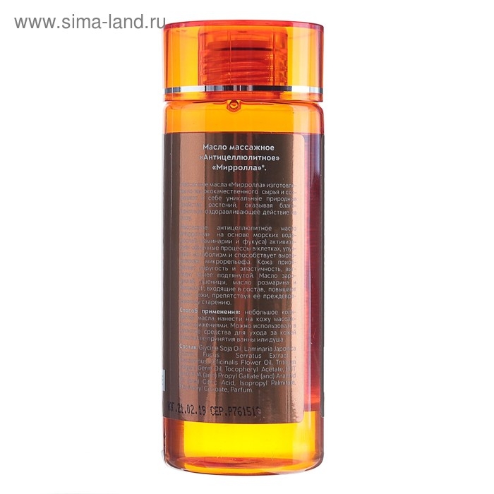 Масло зародышей пшеницы, масло розмарина и витамин Е, входящие в состав, повышают тонус кожи, препятствуя ее преждевременному старению. Mirrolla масло массажное антицеллюлитное имеет лёгкую текстуру, хорошо впитывается и не оставляет жирной пленки на коже. Оно эффективно борется с целлюлитом, улучшает внешний вид кожи и обеспечивает чувство комфорта и расслабления во время массажа. Масло массажное «Антицеллюлитное» «Мирролла» - Маслянистая жидкость светло-желтого цвета Специальные особенности: Без ароматизаторов, без консервантов, без красителей, не содержит парабенов Массажные масла «Мирролла» изготовлены из высококачественного сырья и сохраняют в себе уникальные природные свойства растений, оказывая благоприятное оздоравливающее действие на кожу. Массажное антицеллюлитное масло «Мирролла» на основе морских водорослей (ламинарии и фукуса) активизирует обменные процессы в клетках, улучшает метаболизм и способствует выравниванию микрорельефа.