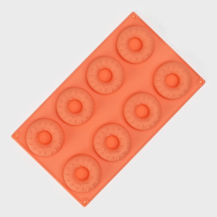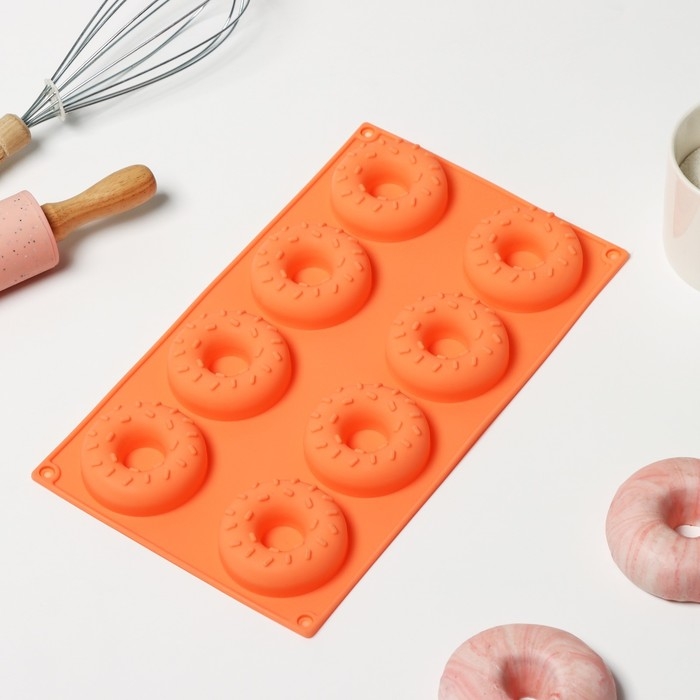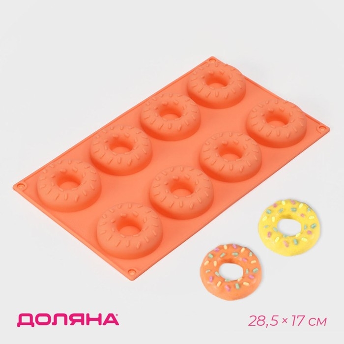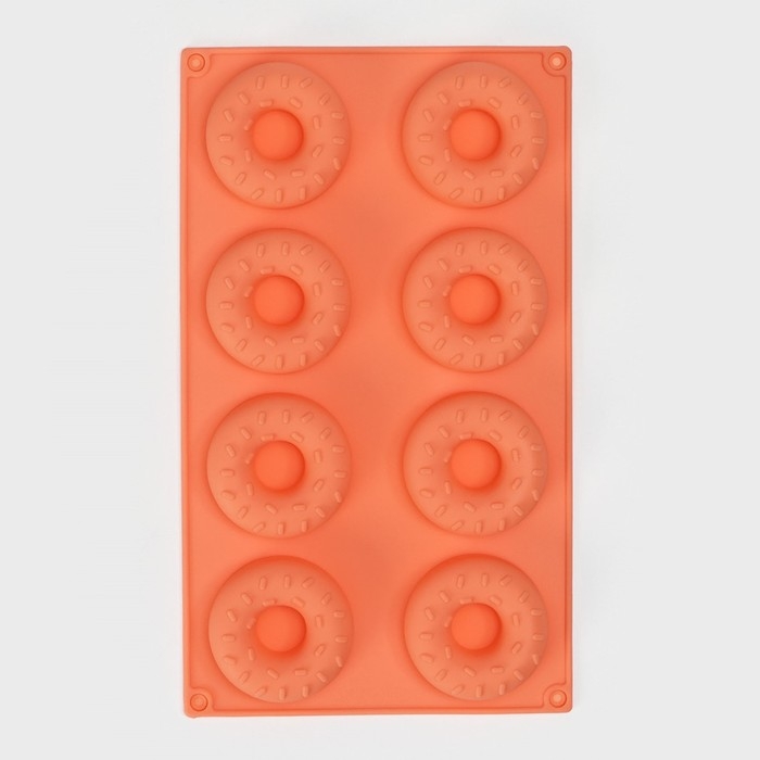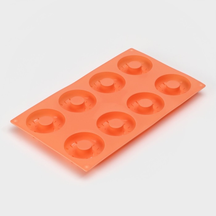 Форма для выпечки Доляна «Сладости.Пончики с кунжутом», силикон, 28,5×17 см, 8 ячеек (d=6,3 см), цвет оранжевый