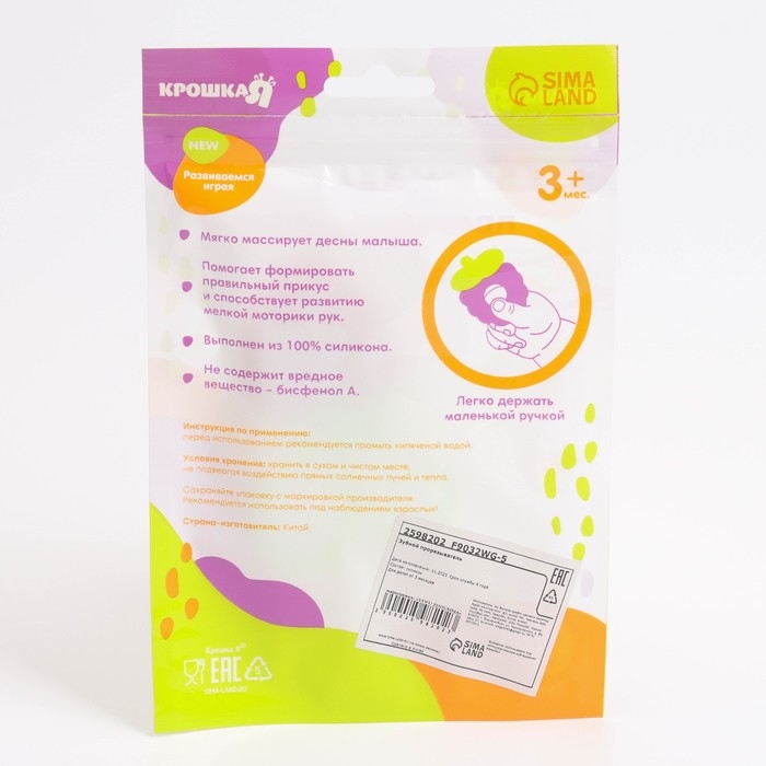 Прорезыватель снимает неприятные ощущения у малыша в период появления первых зубов. Также изделие подготовит ребёнка к процессу жевания, поспособствует формированию правильного прикуса и развитию мелкой моторики рук.