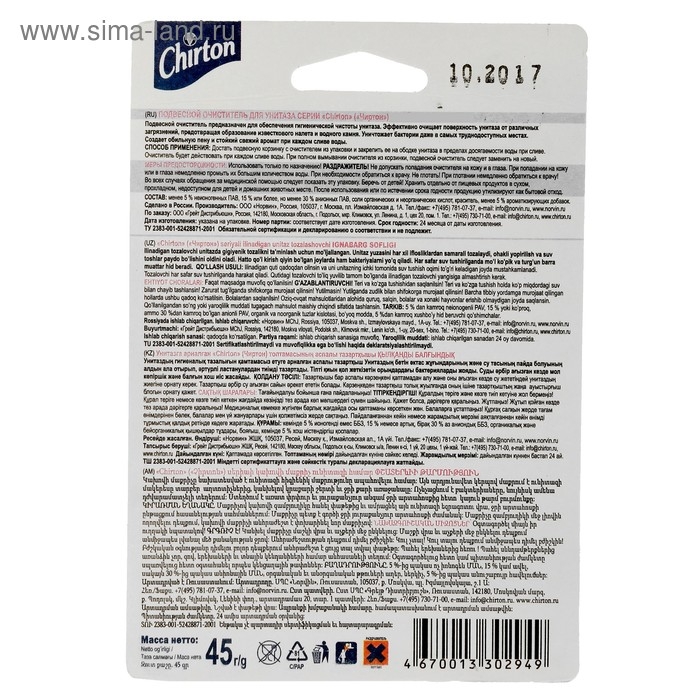 Меры предосторожности: использовать только по назначению. Не допускать попадания очистителя в глаза. При попадании на кожу или глаза немедленно промыть их большим количеством воды. При необходимости обратиться к врачу. Не глотать. При глотании немедленно обратиться к врачу. Во всех случаях обращения за медицинской помощью следует показать этикетку. Беречь от детей. Хранить отдельно от пищевых продуктов в сухом, прохладно, недоступном для детей и домашних животных месте. После использования или истечению срока годности продукцию утилизируют как бытовой отход. Срок годности 24 месяца от даты изготовления.