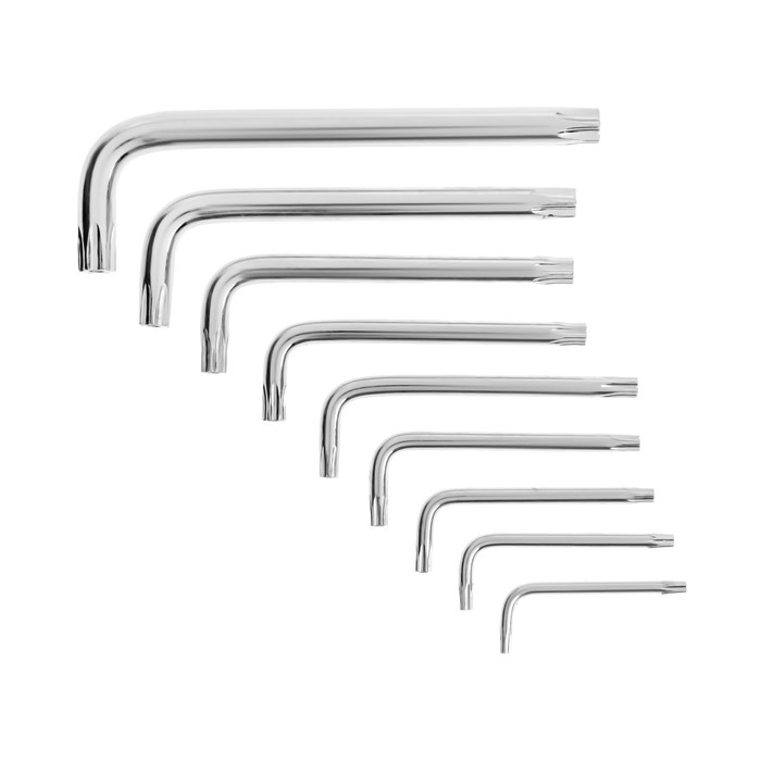 Набор состоит из 9 ключей с размерным рядом: T10, T15, T20, T25, T27, T30, T40, T45, T50.
