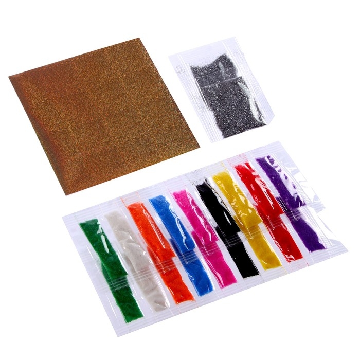 Клеевая основа защищена специальной бумагой, на которую нанесены прорезные контуры. Каждый цвет находится в своей зоне: отделяйте верхний слой стекой, добавляйте блёстки и песок, оформляйте элементы фольгой.