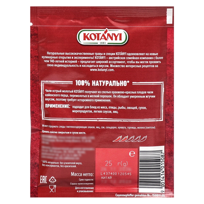 Приправа KOTANYI Чили Кайенский перец, молотый (8800–11200 единиц по шкале остроты Scoville) получают из спелых оранжево-красных перцев чили, перемолотых в мелкий порошок. Он обладает сильным жгучим вкусом, поэтому требует очень осторожного применения. Кайенский перец незаменим при приготовлении блюд из мяса, птицы, рыбы, овощей, супов, морепродуктов, легких соусов, яиц.