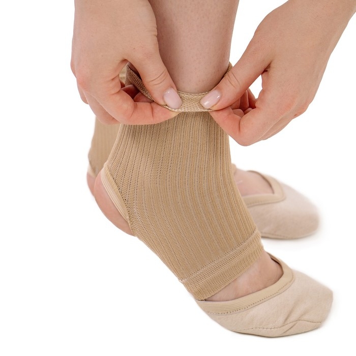 Голеностоп обеспечивает защиту кожи от ссадин во время тренировок. Благодаря компрессии поддерживает голеностоп при выполнении гимнастических элементов.