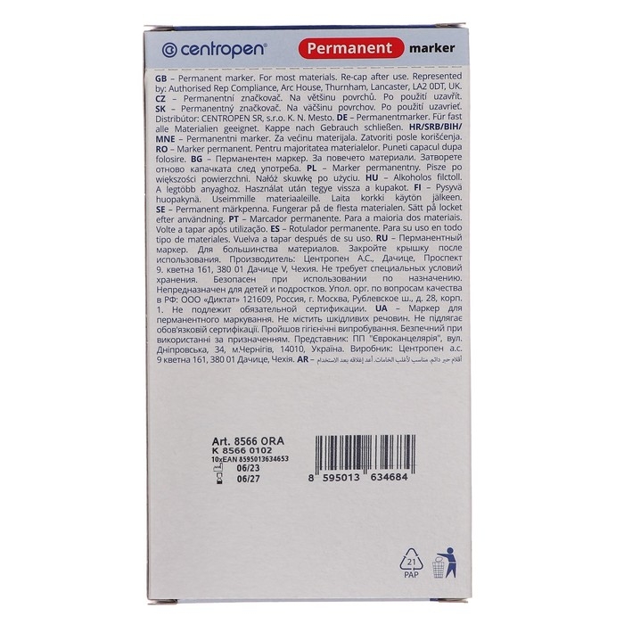 Centropen 8566 — это перманентый маркер, который предназначен для письма на любых поверхностях.