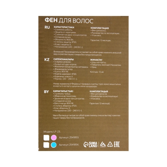 Фен Luazon LF-23, 800 Вт, 2 режима, складная ручка, розовый