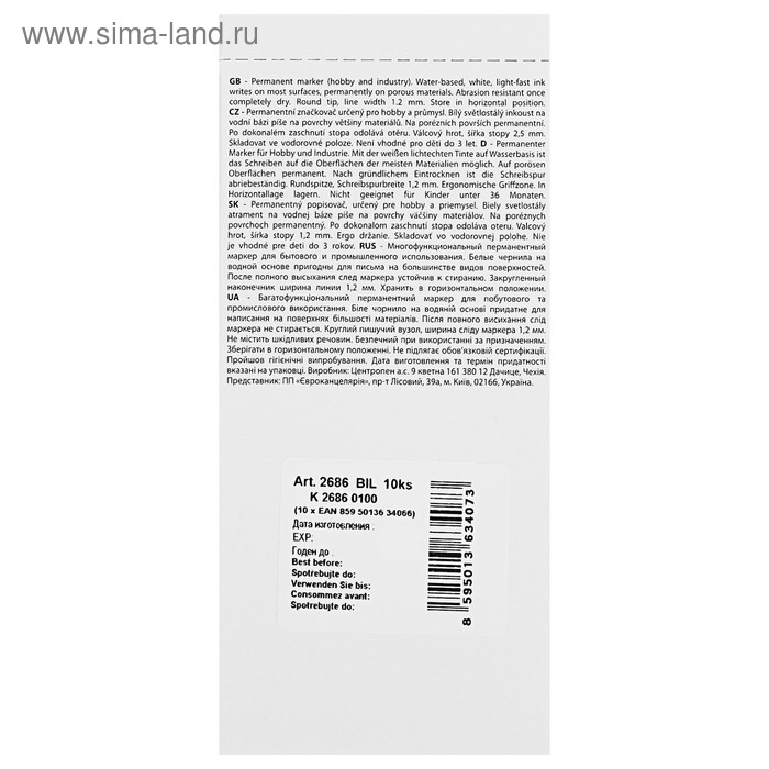 Маркер перманентный 2.5 мм Centropen 2686, линия 1,2 мм, цвет белый