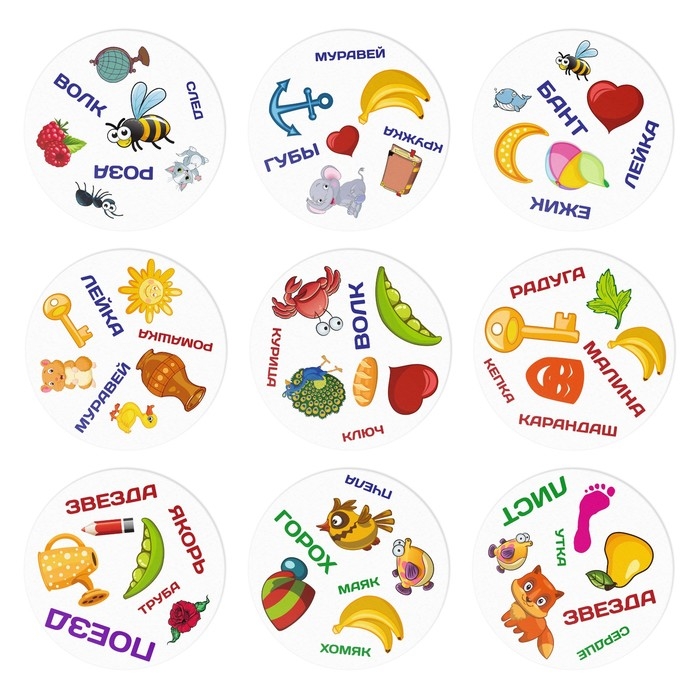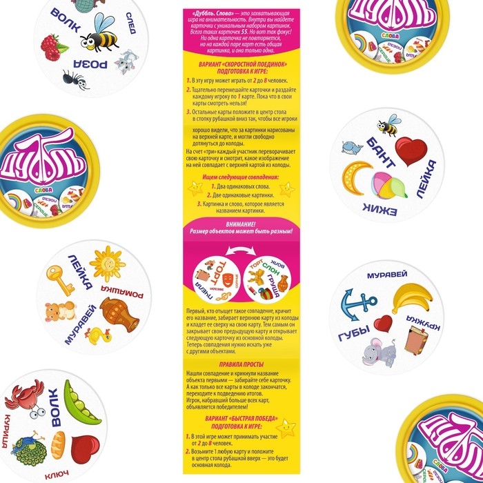 Игроки ищут следующие совпадения: 2 одинаковые слова, 2 одинаковые картинки, картинка и слово, которое является названием картинки.
