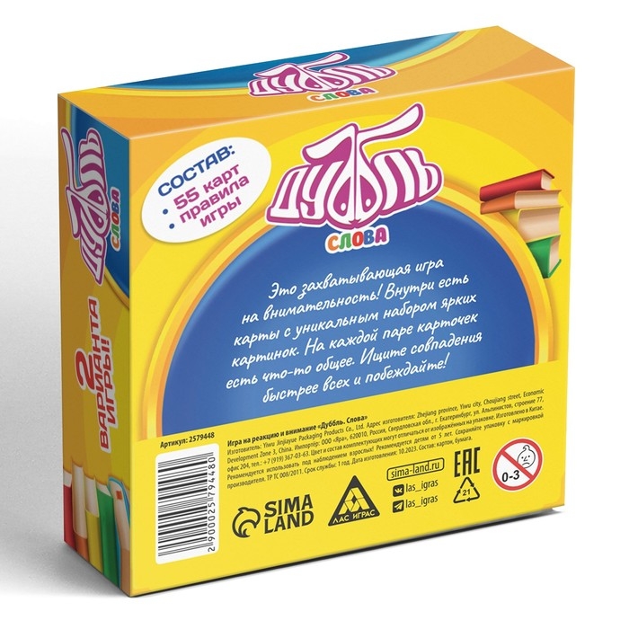Это захватывающая игра на внимательность, в которой собрано 55 карточек. Но вот фокус! Ни одна из них не повторяется, но в каждой паре есть общая картинка — и она только одна!