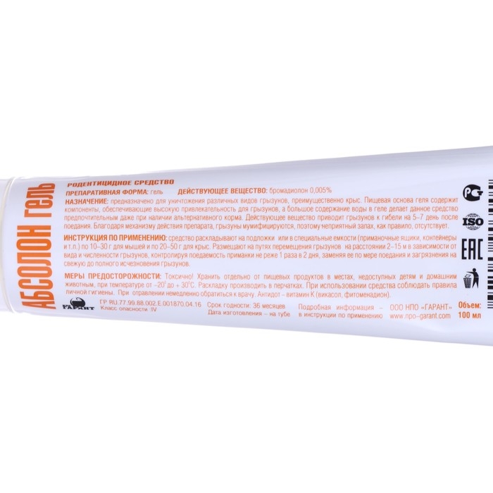 Абсолон гель содержит специальные пищевые компоненты, привлекательные для крыс, а также большой процент воды, что делает эту приманку привлекательной для грызунов даже при наличии большого количества альтернативного корма. Активное действующее вещество приманки относится к группе самых эффективных на сегодняшний день родентицидов и гарантирует гибель грызунов на 3-6 день после однократного поедания ими приманки.