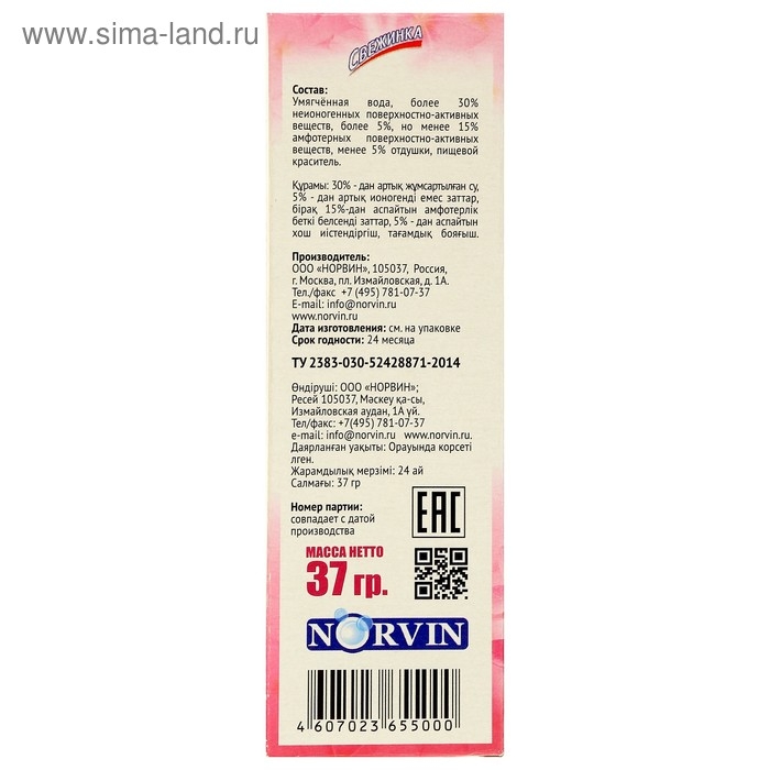Состав: умягченная вода, более 30% неиногенных поверхно-активных веществ, более 5% но не менее 15% амфотерных поверхностно-активных веществ, менее 5% отдушки, пищевой краситель.