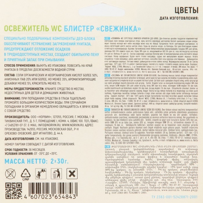 Подвесной очиститель для унитаза - аромат цветы. Специально подобранные компоненты део-блока обеспечивают устранение загрязнений унитаза, предупреждают отложения осадков в труднодоступных местах, создают обильную пену и приятный запах при смывании.