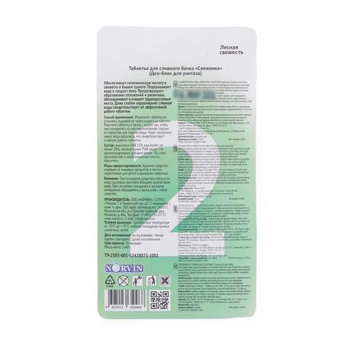 Таблетка для сливного бачка аромат – хвои. Предназначена для дезинфекции и чистки унитаза. Она уничтожает бактерии, дезодорирует поверхность, препятствует отложению водного и мочевого камня, предотвращает появление ржавчины на стенках унитаза и сливного бачка. Таблетка помещается непосредственно в сливной бачок. Постепенно растворяясь в воде, она образует на поверхности унитаза защитную плёнку, которая препятствует его дальнейшему загрязнению. Вода с приятным запахом и активно действующей пеной эффективно очищает и дезинфицирует унитаз. Благодаря низкой скорости растворения одной таблетки хватает не менее чем на 400 смывов сливного бачка. Не содержит вредных для человека химических соединений. Обеспечивает равномерность нанесения дезинфектанта и моющего средства по всей внутренней поверхности унитаза.