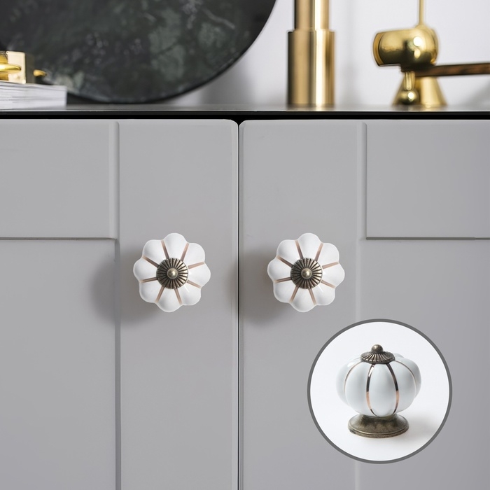 Фурнитура Ceramics устанавливается на фасад мебели для кухни, гостиной или спальни. Изделие имеет металлическое основание и керамическую вставку в форме цветка. Благодаря сочетанию глянца и искусственно состаренной поверхности ручка гармонично впишется в классический интерьер, а также подойдёт для комнаты в стиле прованс.