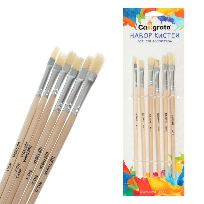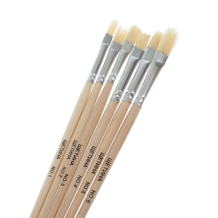 Набор кистей, щетина, плоские, 6 штук: № 1, 2, 3, 4, 5, 6, с деревянными ручками, на блистере