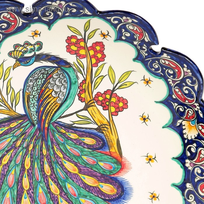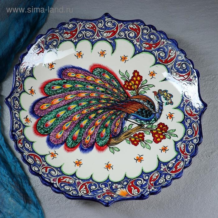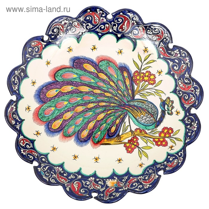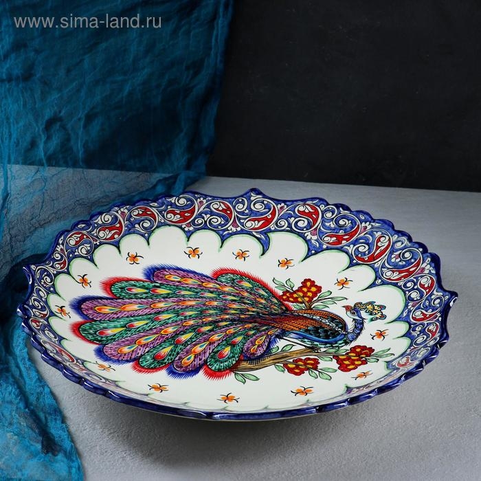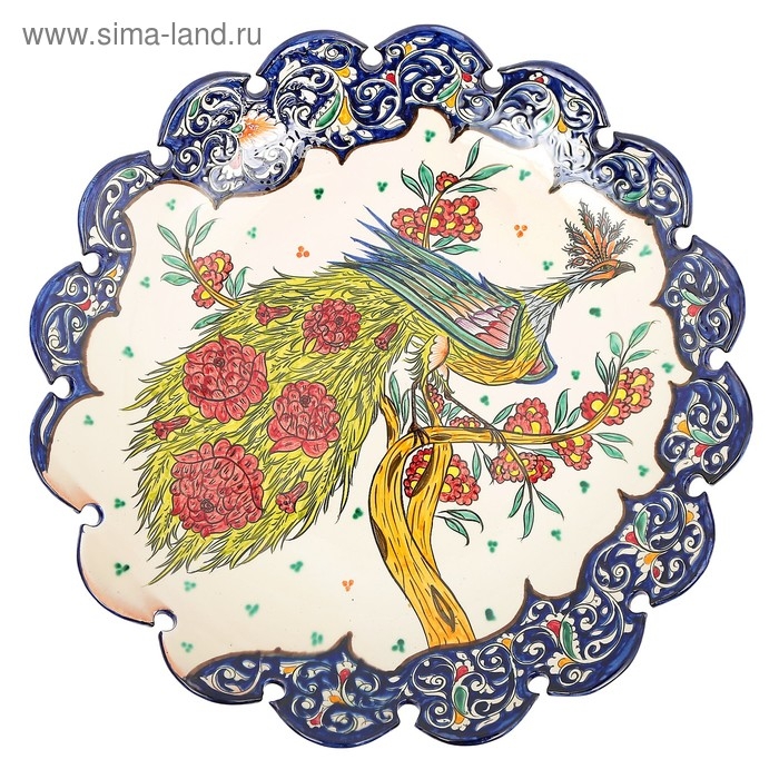 Ляган Риштанская Керамика "Жар птица", 42 см, синий, рифлённый
