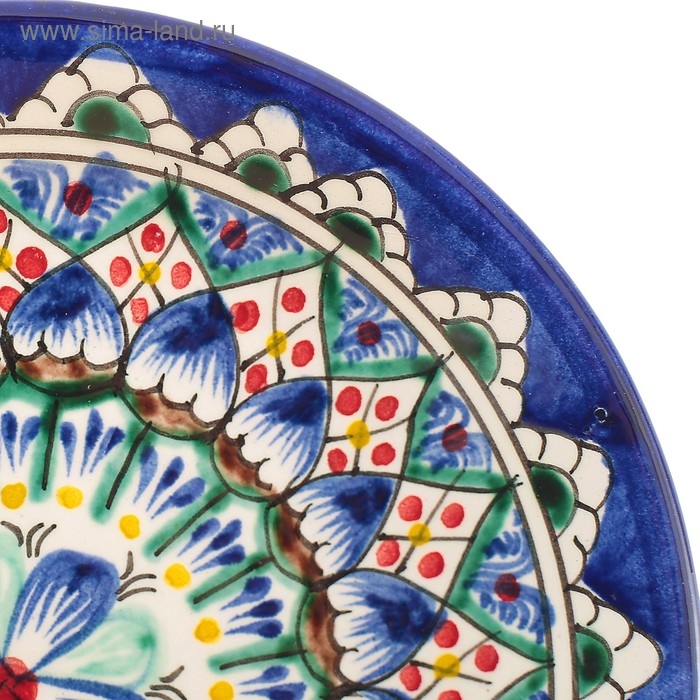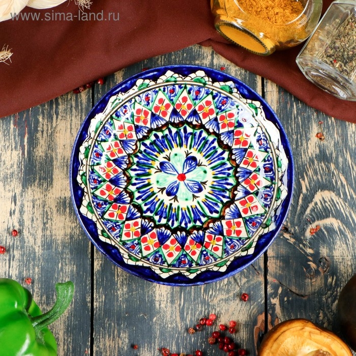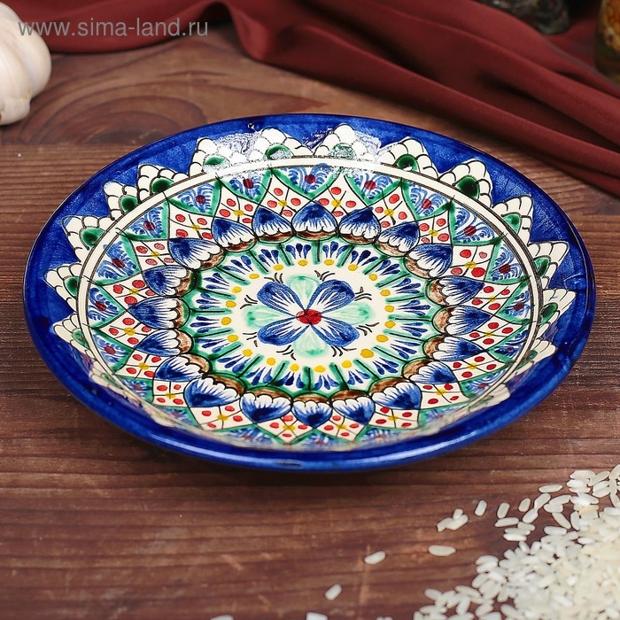 Тарелка Риштанская Керамика "Цветы", синяя, плоская, 15 см