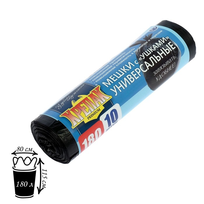 Мешки для мусора «КРЕПАК», 180 л, с ушками, ПНД, 20мкм, 80×115 см, 10шт, цвет чёрный