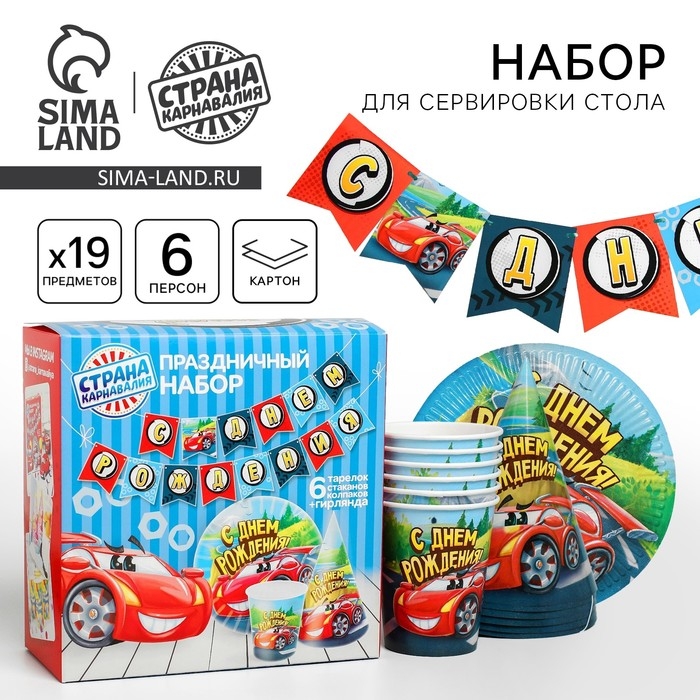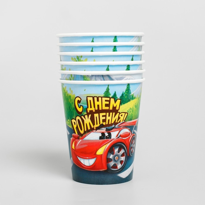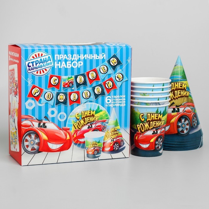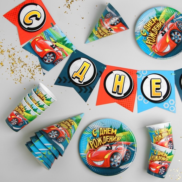 Набор бумажной посуды одноразовый С днём рождения», крутые тачки: 6 тарелок, 6 стаканов, 6 колпаков, 1 гирлянда