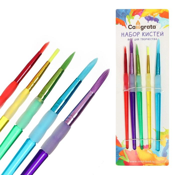 Набор кистей нейлон 5 штук, круглые, с цветными ручками, с резиновыми держателями