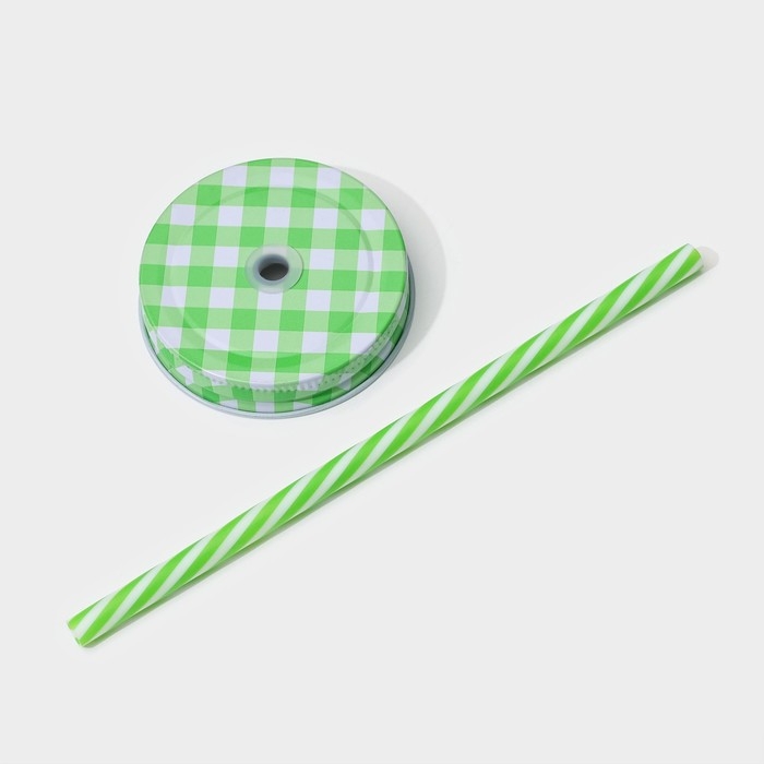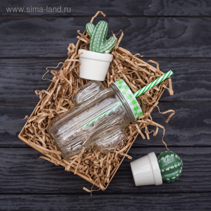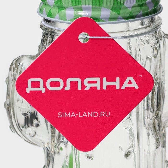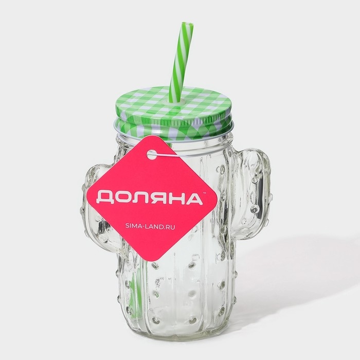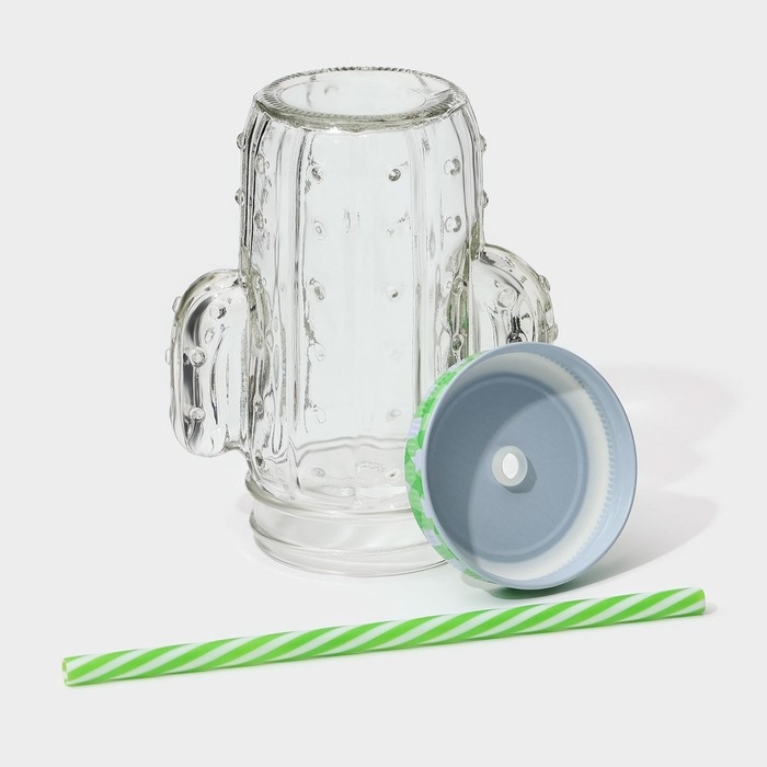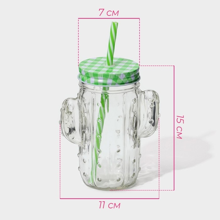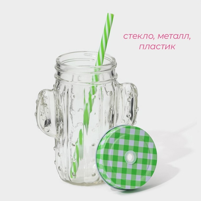 Кружка стеклянная с крышкой и трубочкой Доляна «Кактус», 450 мл, 11×7×15 см