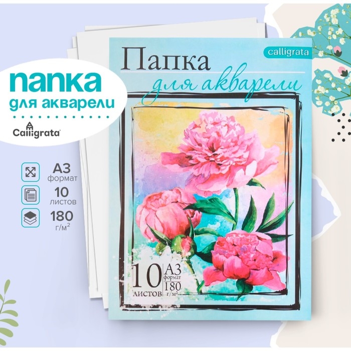 Папка для акварели А3, 10 листов "Цветы", блок 180 г/м2, рисовальная