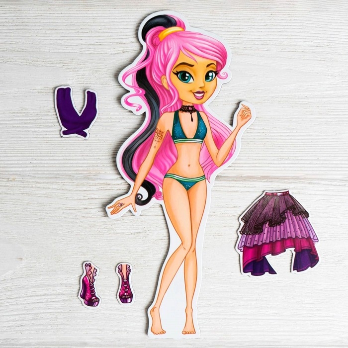 - Выберите подходящий наряд и аксессуары, а затем приложите их к кукле. Одежда приклеится к ней благодаря магнитной ленте.