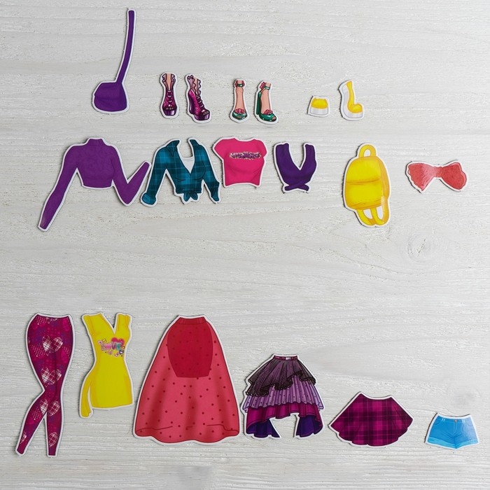 - 20 магнитных элементов: одежда, обувь и аксессуары.