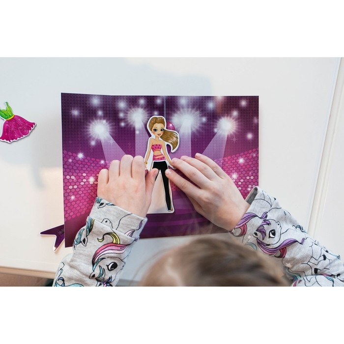 Ваша принцесса любит модничать? Тогда этот набор станет эффектным подарком для неё! Магнитный игра «Одень куклу: супер-звезда» позволит менять одежду кукле и создавать разные образы. С ним ребёнок не ограничен в выборе стиля и цветовой гаммы — в каждом образе можно легко комбинировать и менять одежду между собой.