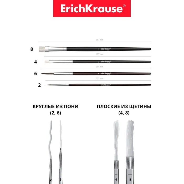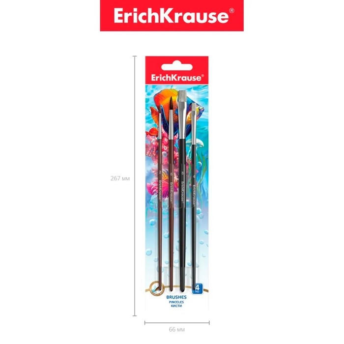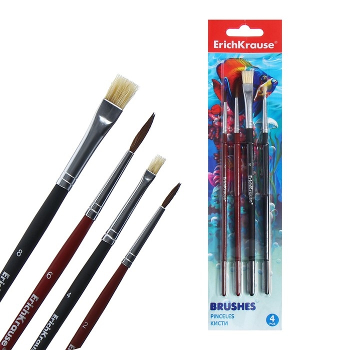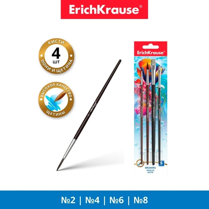 Набор кистей, микс, 4 штуки, Erich Krause. Состав: "Пони" круглые № 2 и № 6, щетина плоская № 4 и № 8, в блистере